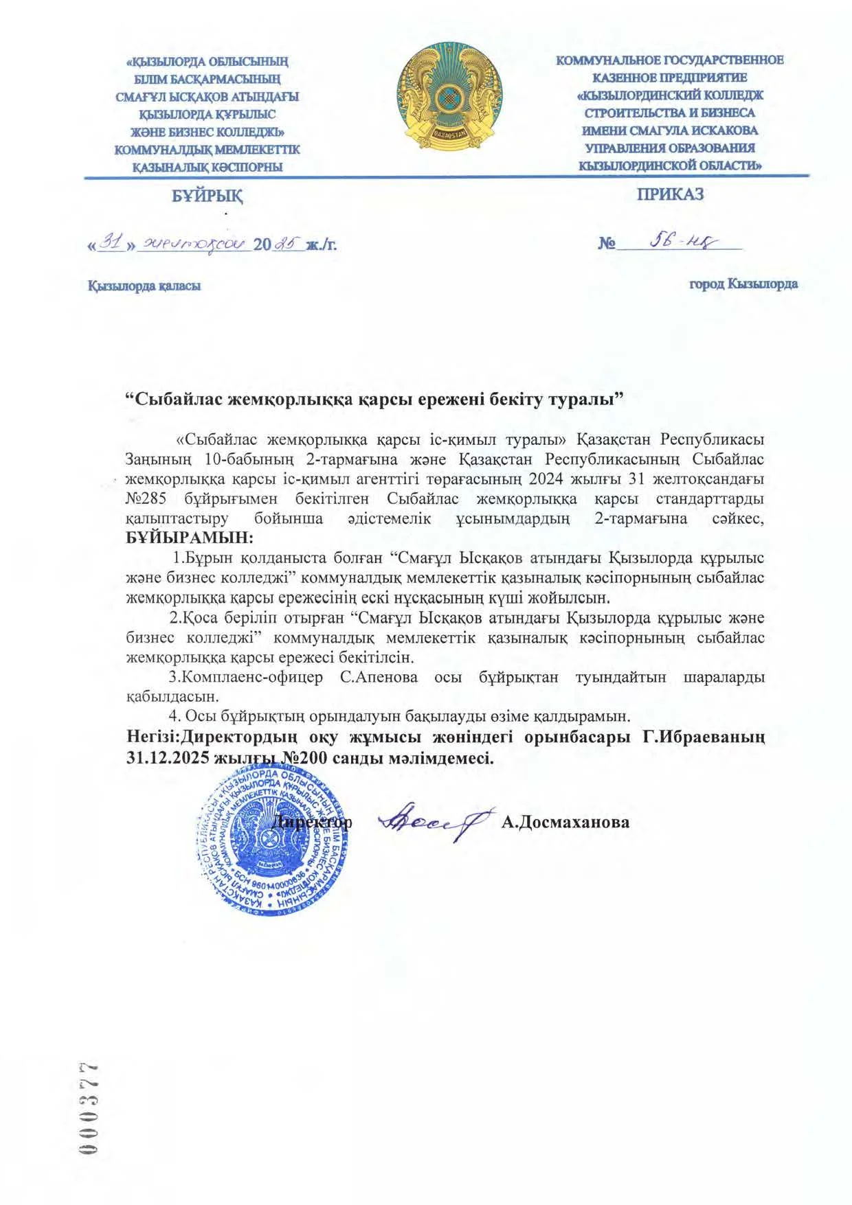 управления образования Кызылординской области